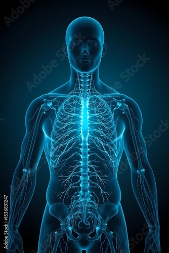 A futuristic visualization of the vagus nerve highlighted within a human body silhouette with glowing nerve pathways extending from the brainstem through the chest and abdomen