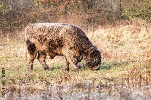 a galloway ox is grazing in a nature park