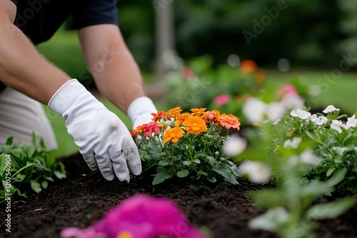 A gardener in white gloves carefully plants vibrant orange and yellow flowers in rich soil, showcasing the beauty of home gardening in a lush, green environment.