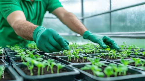 A gardener transplanting seedlings in a greenhouse, with trays of young plants all around