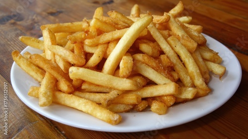 A generous serving of crispy golden fries is arranged on a white plate resting on a wooden table perfect for enjoying with friends during lunch or dinner.