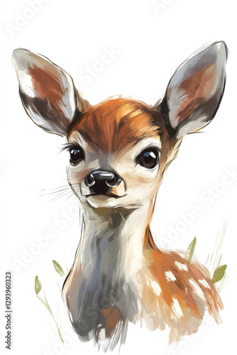 A gentle digital illustration of a brown fawn with soft spots, surrounded by green leaves, set against a light natural background. This tender and peaceful design is perfect for nature decor, children