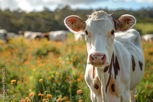 A gentle white cow with a distinctive brown patch gazes curiously among a field of vibrant orange flowers
