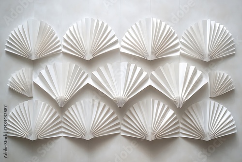 A geometric arrangement of white paper fans, meticulously folded to create an elegant and visually captivating wall art display