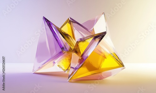 A geometric composition with minimalist elements, rendered in 3D with yellow and purple hues.