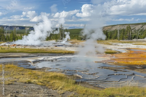 A geyser field dotted with numerous geothermal features, each one exhibiting its own unique characteristics and eruption patterns, Generative AI