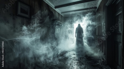 A Ghostly Figure Stands in a Dark and Foggy Hallway of an Abandoned House