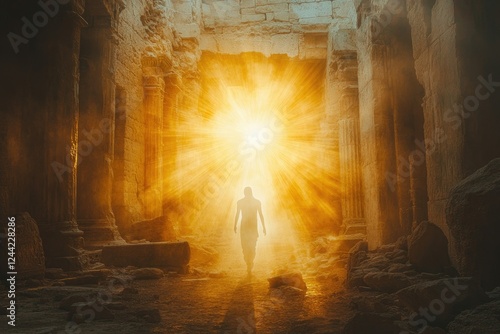 A ghostly, translucent figure walking through an ancient temple, illuminated by golden sun rays breaking through the ruins, copy space background
