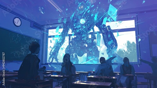 A Giant Mechanical Being Appearing Through a Window in a Classroom