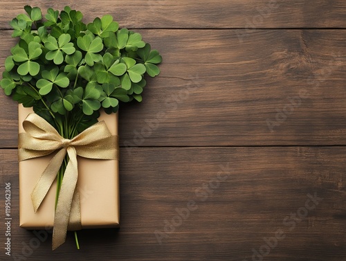 A gift box adorned with a golden ribbon, holding vibrant green clovers, set against a rustic wooden background.