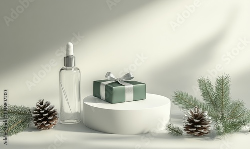 A gift box with a ribbon is placed on a white pedestal next to a bottle