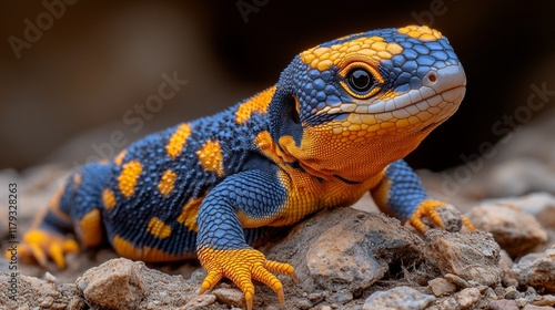 A gila monster lizard, adorned in vivid hues, navigates the rocky surface, revealing its one-of-a-kind designs.