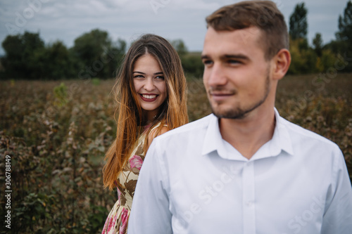 A girl and a guy are walking in the nature. Portrait of a couple, a love story.Happy smiling, loveing couple together outstretched at beautiful nature. Lovestory