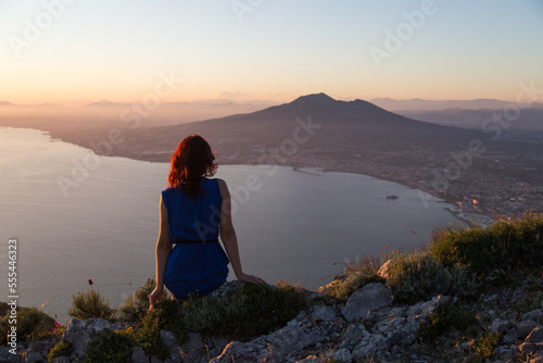 A girl at sunset looks at the Gulf of Naples and Mount Vesuvius