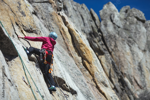 A girl climber climbs the rock wall. Climbing gear. Climbing equipment.
