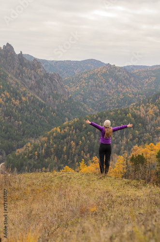A girl in a lilac jacket jumps on a mountain, a view of the mountains and an autumnal forest overcast. Free space for text