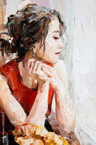 .A girl in a red dress is sitting in a cafe. An elegant woman has breakfast in the morning in a cafe. Oil painting on canvas.