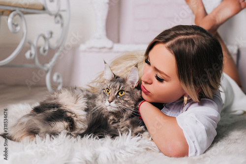 A girl in a white shirt lies on a fluffy white carpet near the fireplace with a fluffy cat. Woman stroking a cat
