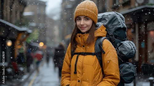 a girl in a yellow jacket and a yellow hat is traveling with a tourist backpack