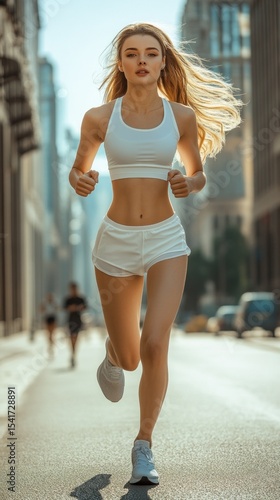 A girl in sports clothes running on the city street, active lifestyle, urban sports.