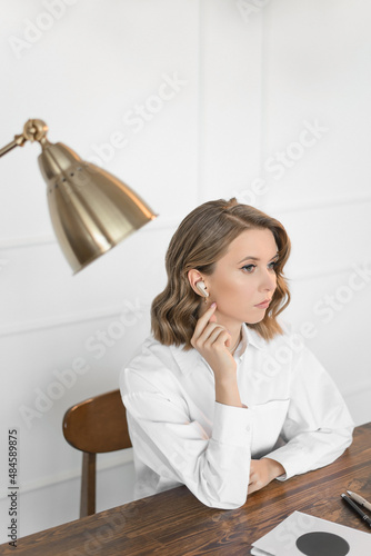 A girl in the office with a wireless earphone. A young woman works at a table.