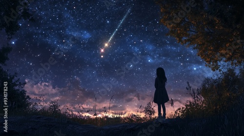 A girl makes a wish on a falling star on a clear night. A young girl admires the starry sky.