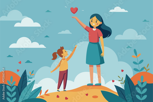 A girl stands proudly with her hand on her heart, showcasing love and connection against a vibrant landscape filled with clouds and greenery