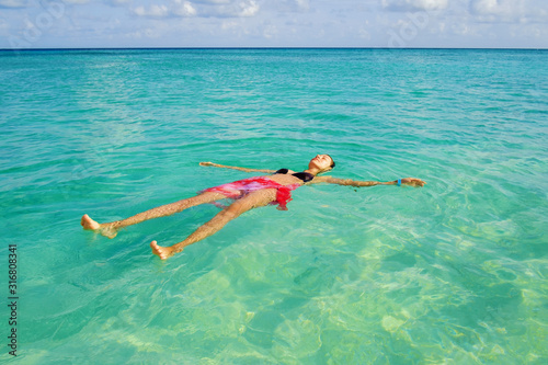 A girl swims on her back in the clear ocean on a sunny day