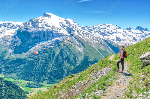 A girl with a red backpack admiring the scenery of the Alpine mountains. Landscape of the Swiss Alps, the Engelberg resort.