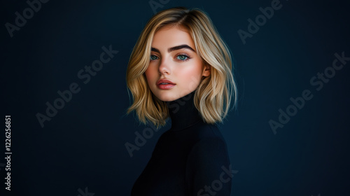 A glamorous shot of a radiant blonde woman with voluminous hair, dressed in a form-fitting black outfit, illuminated by soft directional lighting