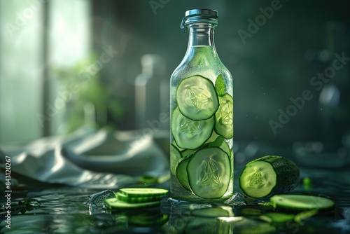 A glass bottle filled with fresh cucumbers sitting on a table