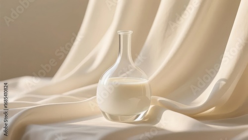 A glass bottle filled with milk placed on a soft, draped fabric background.