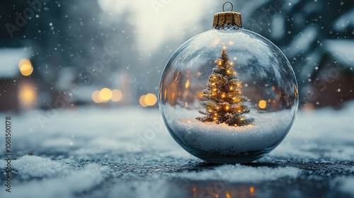 A glass Christmas bauble filled with artificial snow and a tiny Christmas tree inside, rendered in 4K.