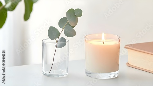 A glass container with a eucalyptus sprig and a lit candle beside a closed book on a light-colored surface. Concept Eucalyptus Decor, Cozy Atmosphere, Candlelight Ambiance, Styling with Books