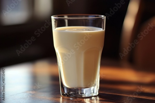 A glass filled with creamy soymilk sits on a wooden table in a warm, inviting cafe, suggesting a peaceful moment to enjoy