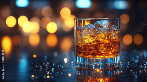 A glass filled with whiskey and ice sits on a bar surface, illuminated by soft ambient lights, creating a warm and inviting atmosphere