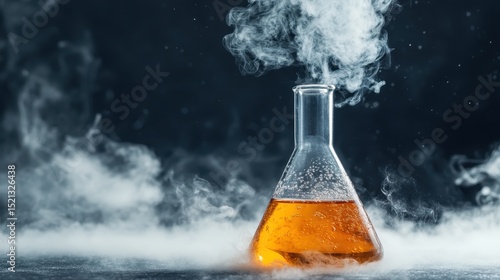A glass flask filled with a vibrant orange liquid, emitting smoke, perfect for illustrating scientific experimentation and the excitement of discovery in a laboratory.