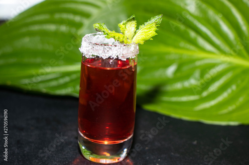A glass is sprinkled with sugar, there is a strawberry tincture inside, a sprig of mint on top against a dark background, and the green leaves of the Hosts are in the background.