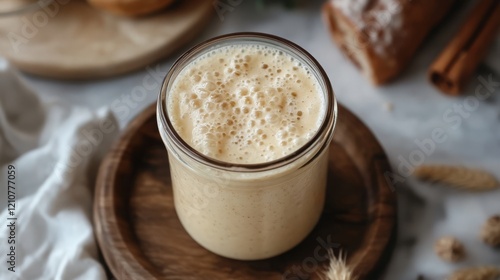 A glass jar with active, bubbly sourdough starter on the top. Homemade bread baking