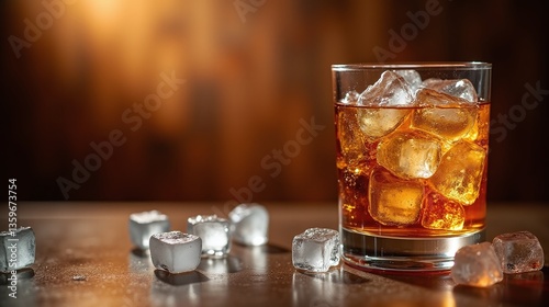 A glass of amber-colored liquid with ice cubes on a wooden surface.