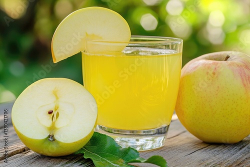 A glass of apple juice with apple slices and whole apples on a wooden surface in outdoor setting