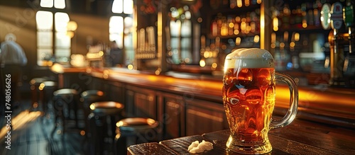 A glass of beer is placed on top of a wooden table, with the radiant light shining through the beverage. This simple yet inviting scene captures the essence of a cozy pub setting.