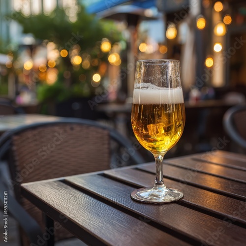 A glass of beer on a wooden table, with a blurred background showing an outdoor setting. The glass of beer has a foamy head and the light illuminating its golden color
