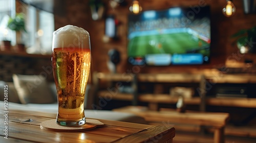 A glass of beer sits on a wooden table in a cozy room with a sports game on TV.