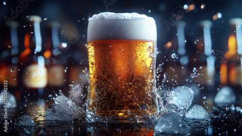 A glass of beer with foam and a splash, with a blurred bar scene in the background
