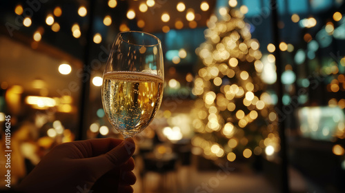 a glass of champagne in a person's hand, against the background of a New Year's corporate party, focus on the glass in the hand