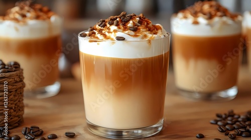 A glass of coffee with a brown foam on top and a sprinkle of coffee beans