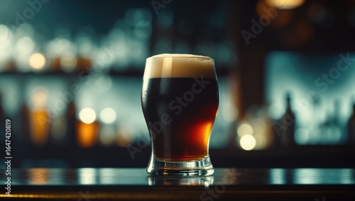 A glass of dark beer with foam on top placed on a bar counter in a dimly lit pub or bar setting.