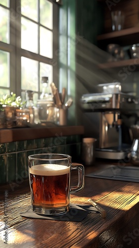 A glass of dark beverage sits on a wooden table, illuminated by sunlight through a window.