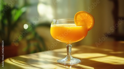 A glass of freshly squeezed orange juice placed on a wooden table in a bright and sunny setting